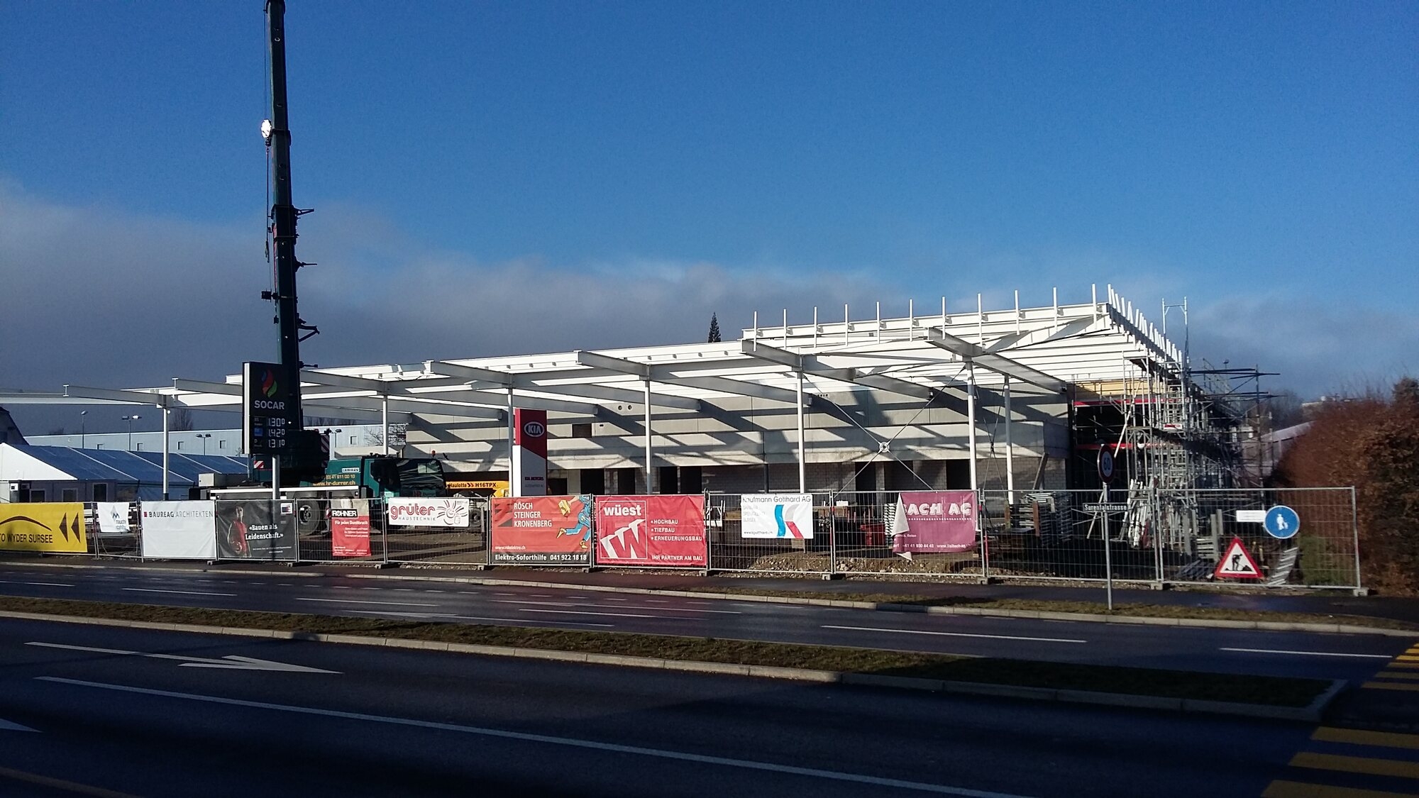 Waschanlage: Auskragende Hauptbinder mit schrägen Stützen